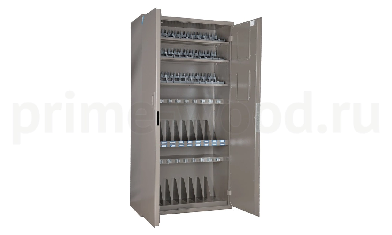 Сейф односекционный, на 20 стволов и 39 ПУ. Ложементы — металлические держатели с резиновыми роликами — 20 штук и пластиковые подставки под пистолет ПУ— 39 штук.